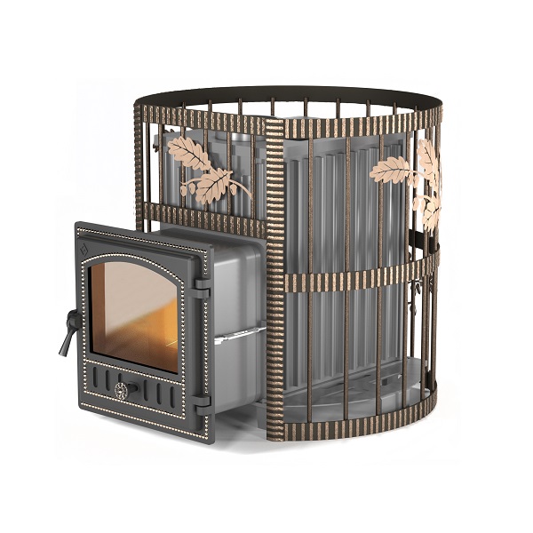 Чугунная банная печь Эверест 24 в кованной сетке. Большая мощность, эстетичный внешний вид, высокая теплоёмкость, вместительная каменка – вот ключевые отличия сборной чугунной печи Эверест 24. Печь рассчитана на объём парного отделения от 15 до 25 кубических метров. В каменку умещается 20-25 килограммов камней крупной фракции. Сетка сделана по комбинированной технологии, с использованием стального прутка и кованой стальной ленты. Декоративные элементы придают сетке элегантный внешний вид и хорошо вписываются в тематический банный дизайн. К основанию печи крепятся фасонные стальные детали, образующие поверхность для укладки камней. Сетка предназначена для обустройства открытой каменки, повышения теплоёмкости печи, выравнивания скорости нагрева парной. Наполнение сетки камнями помогает защитить парильщиков от жёсткого инфракрасного излучения, возникающего при нагреве металлической поверхности печи.