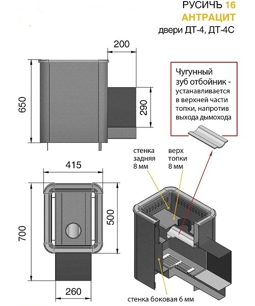 Печь ТМ Везувий Русичъ имеет сертификат Госстандарта России, санитарно-эпидемиологическое заключение, сертификат пожарной безопасности и соответствует требованиям пожарной безопасности (НПБ 252-98). Банная печь Русичъ ВС укомплектована чугунной дверцей с жаропрочным стеклом. Дровяная печь Везувий Русичъ 16 ВС рассчитана на объем парильного помещения 8-18 м3. В конструкции данной печи предусмотрен топочный тоннель длиной 250 мм, при помощи которого печь топится из соседнего помещения, смежного с парильным.