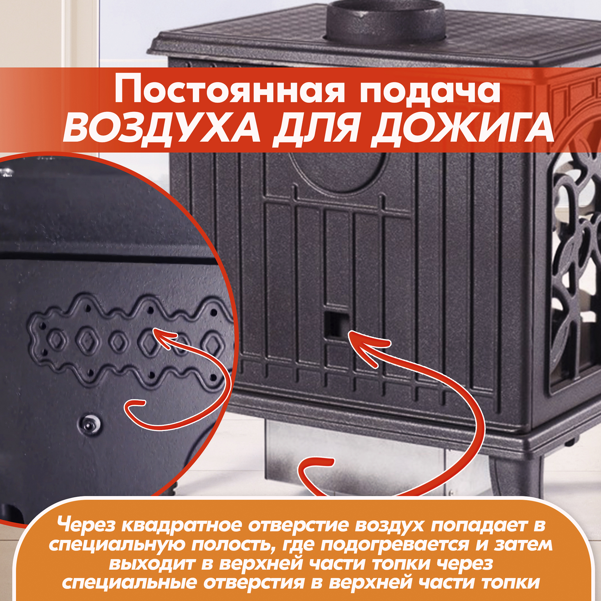 В конструкцию чугунной печи-камина внедрена система дожига вторичных газов, позволяющая достичь КПД камина в пределах 82%.