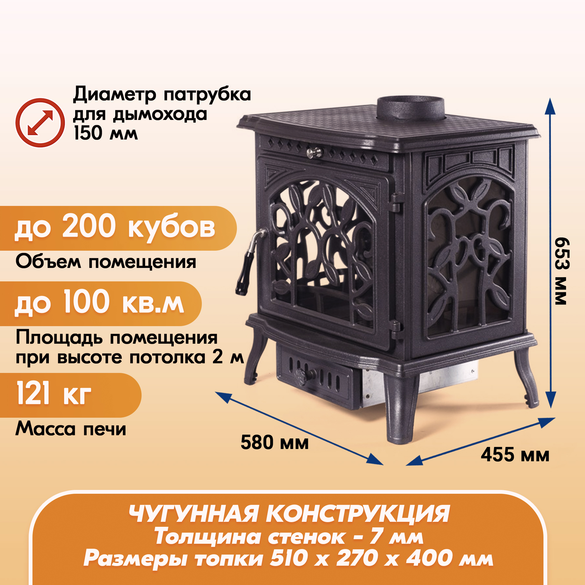 Боковые стенки и дверца печи-камина оформлены большими окнами из огнеупорного стекла, дополненными цветочным узором из чугуна.
