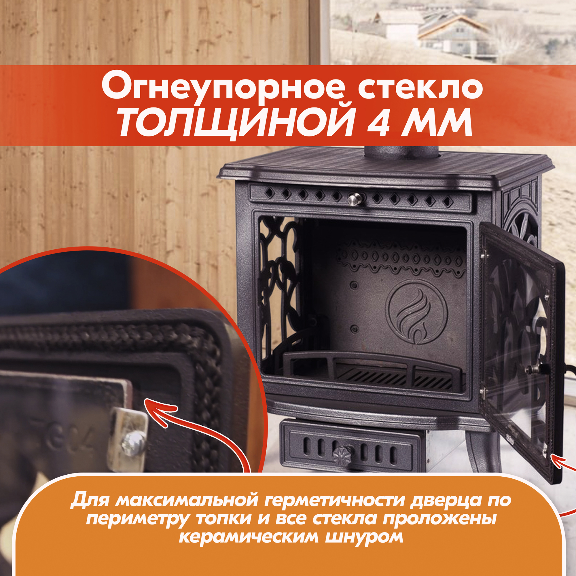 Бесспорным достоинством этой печи является ее интересный дизайн с тремя жаростойкими окнами, украшенными красивыми чугунными узорами, который привнесет в любое помещение свою изюминку.