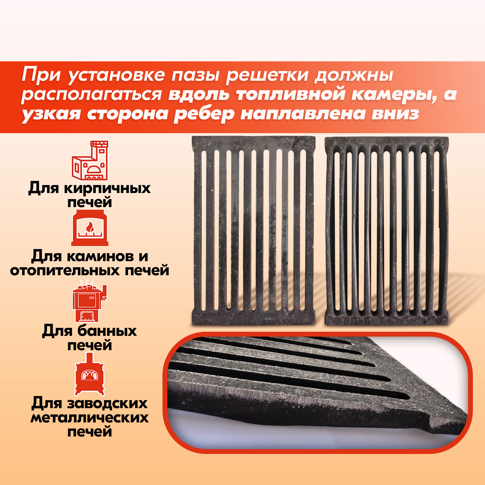 Колосник нужно устанавливать узкой стороной рёбер вниз, в противном случае срок его службы значительно снижается.