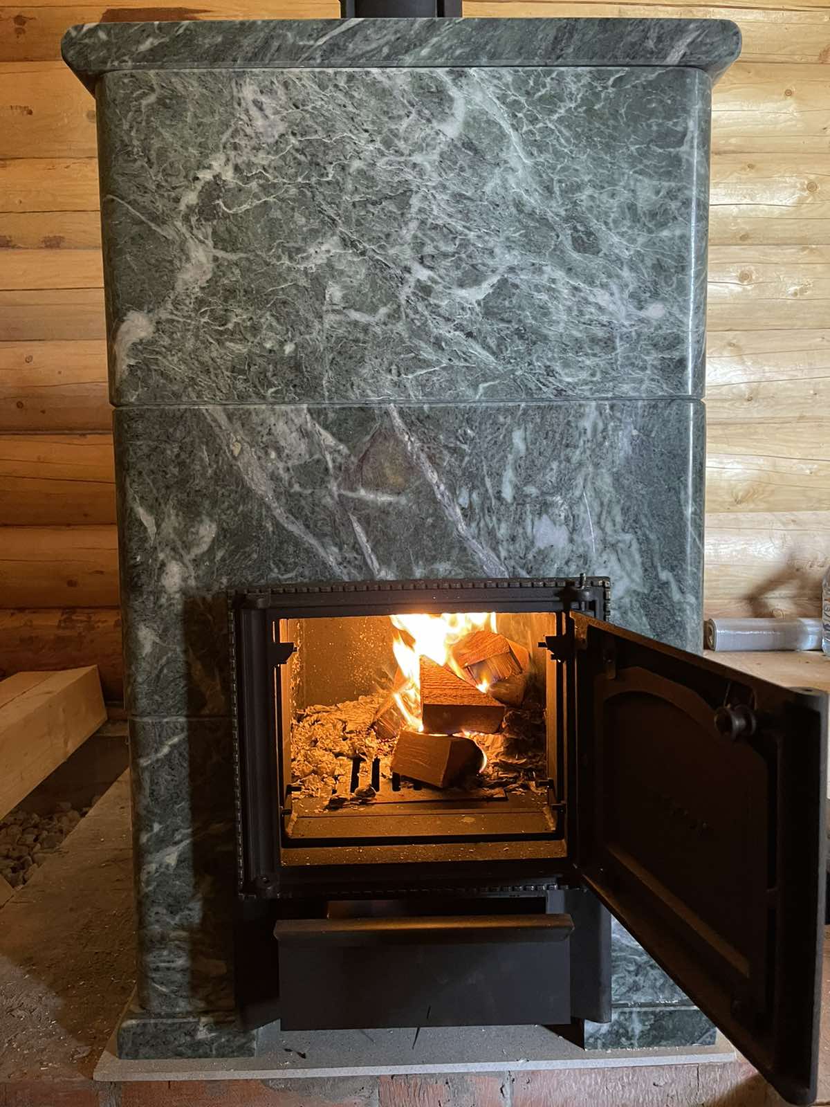 Монтаж Печь банная НМК Сибирь 25 с ЗК без ВТК в облицовке "Президент" змеевик (дверка без стекла), сборка облицовки, установка дымохода.